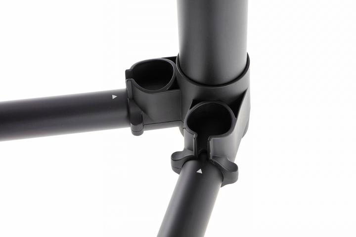 Подставка оснащена складными ножками и выдвижной вертикальной опорой, необходимой для регулировки высоты, сдвигаемой в режиме хранения
