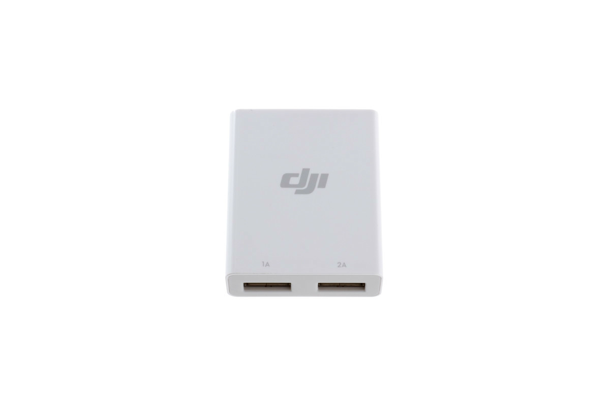 Если внезапно разрядился ваш смартфон или планшет, с которого вы управляете коптером, то с помощью этого зарядного устройства вы можете быстро зарядить свой гаджет от батареи пульта управления или от батареи самого Phantom 4. Два USB-порта зарядного устройства имеют выходное напряжение 1А и 2А для зарядки как небольших смартфонов, так и планшетов соответственно.