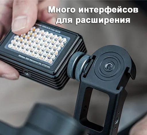 4. Большие возможности для расширения: 3 интерфейса позиционирования Arri 1/4 и два интерфейса C old Shoe. Можно одновременно установить внешний монитор, смартфон и внешний микрофон.